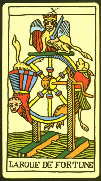 En las primeras versiones que encontramos del Tarot, como en el de Marsella, se representa como el instrumento de tortura, no como una rueda, y en ambos extremos está atada la misma persona, lo que puede venir a significar que somos nosotros mismos los que nos creamos la fortuna.