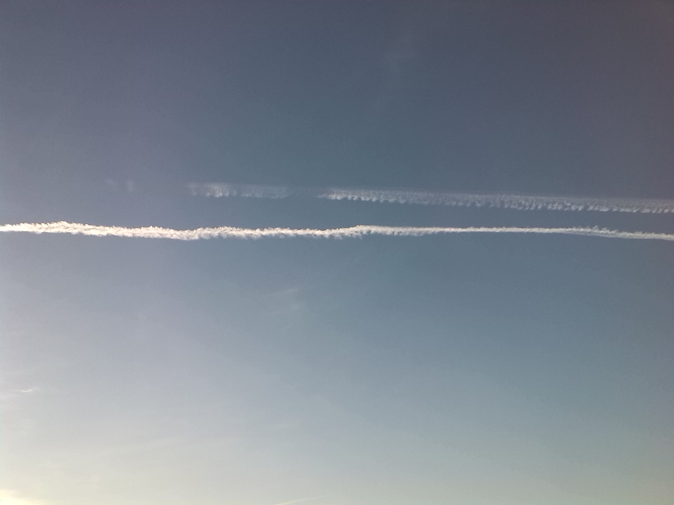 Como comentaba ayer, estoy en al este del país, en una playita que todavía está medio virgen y más en esta época… Esta mañana, antes de salir el sol, el cielo  estaba azul azul… limpio. Cuando estaba saliendo el sol ya he visto alguna estela en el cielo, poquita cosa… cuando he salido de la ducha ya estaba lleno… y media hora más tarde el sol ya estaba metido entre nubes que no son nubes sino los restos de esas estelas… que no son estelas sino algo que los aviones – o algunos aviones – van echando a la atmósfera y que de una raya se van abriendo se van abriendo hasta convertirse en nubes planas que llenan el cielo y lo dejan blanquecino.