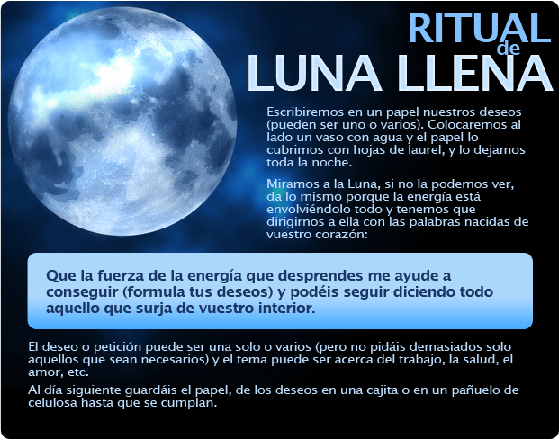 Famosas son las historias de seres que caen hechizados por la fuerza magnética de la luna. Este ritual se puede realizar durante cualquier mes del año en uno de los 3 primeros días de Luna llena. Debes elegir un solo día para hacerlo, que puede ser el primer día de Luna Llena cuando está con toda su potencia luminosa.